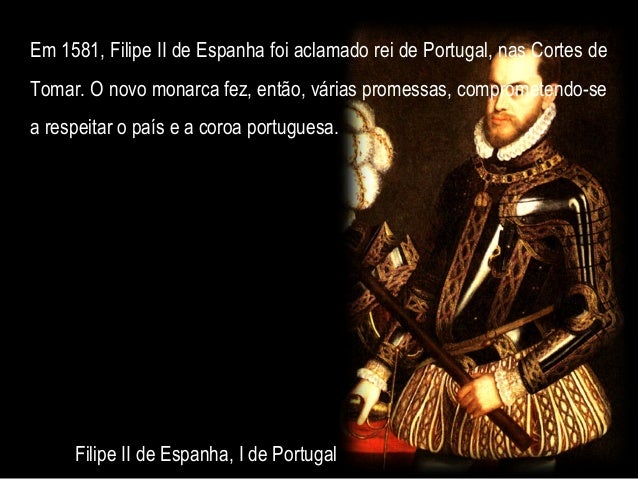 10. 10. Em 1581, Filipe II de Espanha foi aclamado rei de Portugal, nas Cortes de Tomar. O novo monarca fez, então, várias promessas, comprometendo-se a respeitar o país e a coroa portuguesa. Filipe II de Espanha, I de Portugal