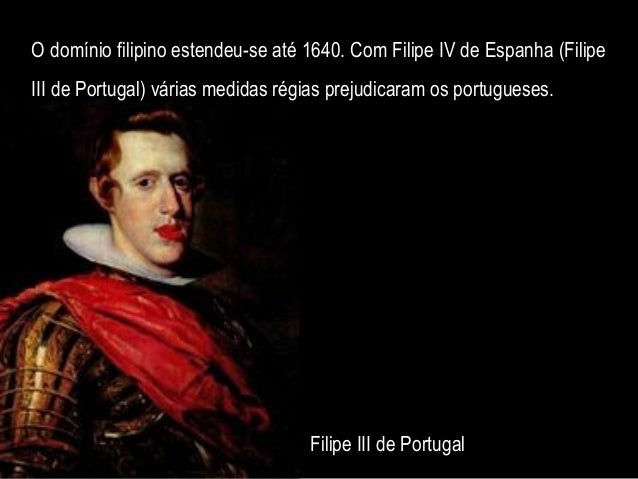 11. 11. O domínio filipino estendeu-se até 1640. Com Filipe IV de Espanha (Filipe III de Portugal) várias medidas régias prejudicaram os portugueses. Filipe III de Portugal