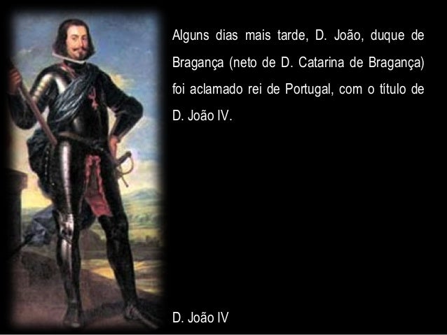 15. 15. Alguns dias mais tarde, D. João, duque de Bragança (neto de D. Catarina de Bragança) foi aclamado rei de Portugal, com o título de D. João IV. D. João IV