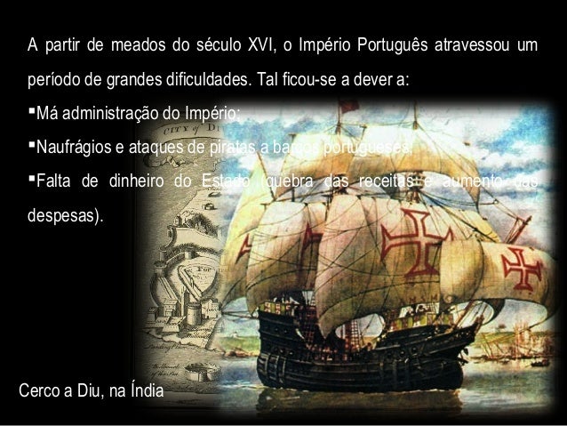 2. 2. A partir de meados do século XVI, o Império Português atravessou um período de grandes dificuldades. Tal ficou-se a dever a: Má administração do Império; Naufrágios e ataques de piratas a barcos portugueses; Falta de dinheiro do Estado (quebra das receitas e aumento das despesas). Cerco a Diu, na Índia