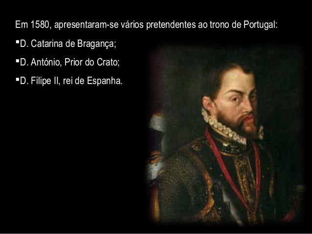 7. 7. Em 1580, apresentaram-se vários pretendentes ao trono de Portugal: D. Catarina de Bragança; D. António, Prior do Crato; D. Filipe II, rei de Espanha.