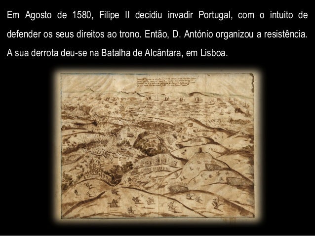 8. 8. Em Agosto de 1580, Filipe II decidiu invadir Portugal, com o intuito de defender os seus direitos ao trono. Então, D. António organizou a resistência. A sua derrota deu-se na Batalha de Alcântara, em Lisboa.