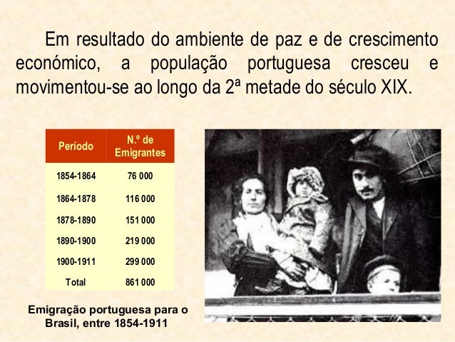 13. 13. Em resultado do ambiente de paz e de crescimentoeconómico, a população portuguesa cresceu emovimentou-se ao longo da 2ª metade do século XIX. N.º de Período Emigrantes 1854-1864 76 000 1864-1878 116 000 1878-1890 151 000 1890-1900 219 000 1900-1911 299 000 Total 861 000 Emigração portuguesa para o Brasil, entre 1854-1911