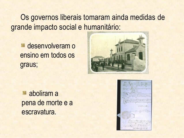 16. 16. Os governos liberais tomaram ainda medidas degrande impacto social e humanitário: desenvolveram o ensino em todos os graus; aboliram a pena de morte e a escravatura.