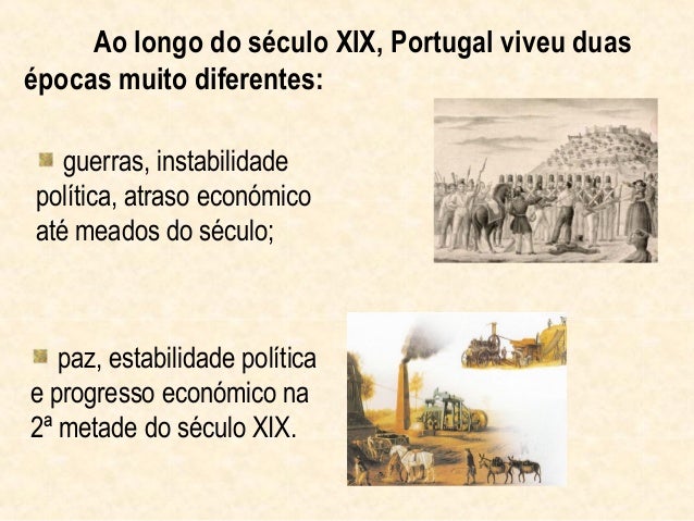 2. 2. Ao longo do século XIX, Portugal viveu duasépocas muito diferentes: guerras, instabilidadepolítica, atraso económicoaté meados do século; paz, estabilidade políticae progresso económico na2ª metade do século XIX.