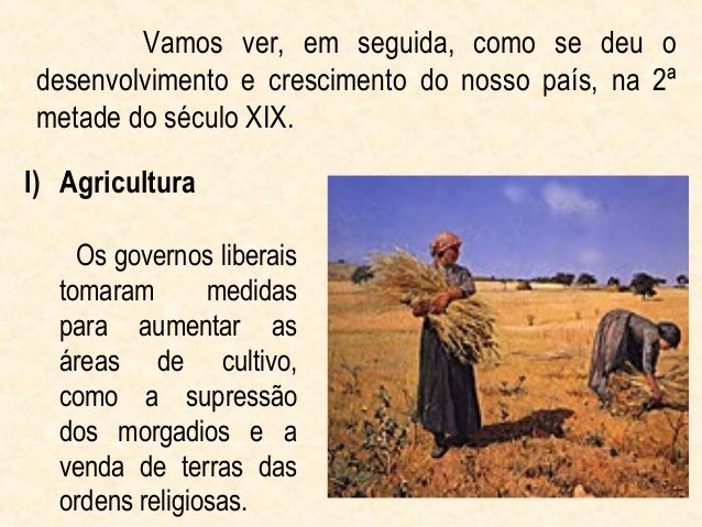 3. 3. Vamos ver, em seguida, como se deu odesenvolvimento e crescimento do nosso país, na 2ªmetade do século XIX.I) Agricultura Os governos liberais tomaram medidas para aumentar as áreas de cultivo, como a supressão dos morgadios e a venda de terras das ordens religiosas.