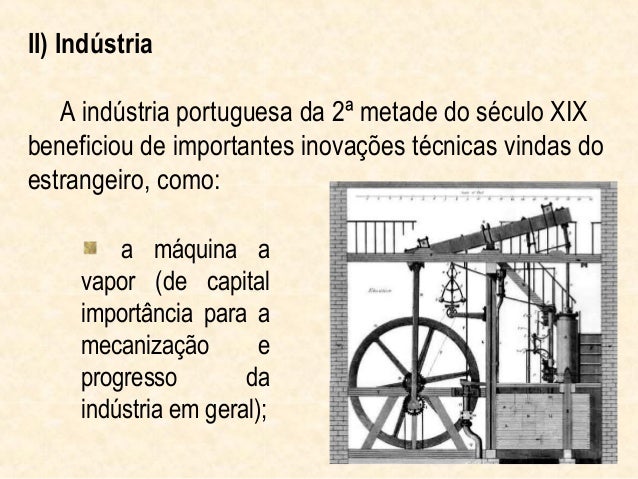 5. 5. II) Indústria A indústria portuguesa da 2ª metade do século XIXbeneficiou de importantes inovações técnicas vindas doestrangeiro, como: a máquina a vapor (de capital importância para a mecanização e progresso da indústria em geral);
