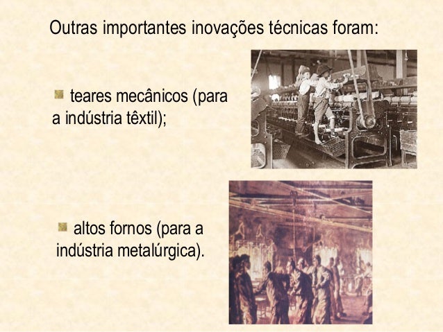 6. 6. Outras importantes inovações técnicas foram: teares mecânicos (paraa indústria têxtil); altos fornos (para aindústria metalúrgica).