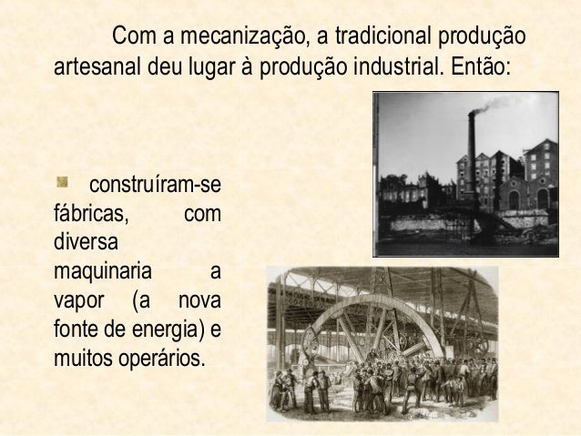 7. 7. Com a mecanização, a tradicional produçãoartesanal deu lugar à produção industrial. Então: construíram-sefábricas, comdiversamaquinaria avapor (a novafonte de energia) emuitos operários.