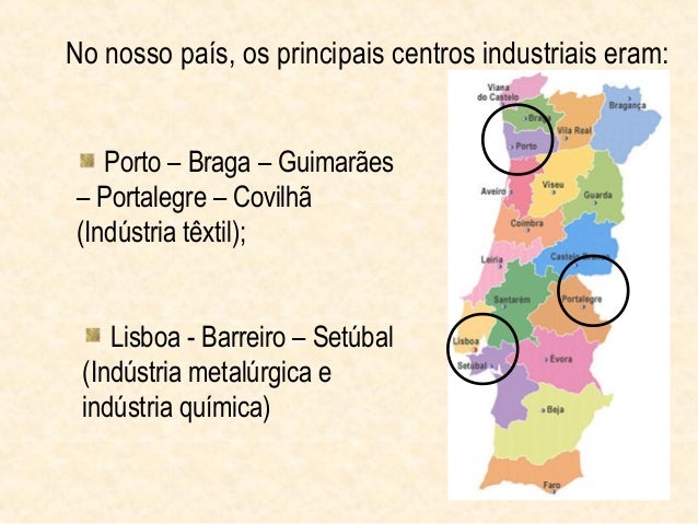 8. 8. No nosso país, os principais centros industriais eram: Porto – Braga – Guimarães– Portalegre – Covilhã(Indústria têxtil); Lisboa - Barreiro – Setúbal (Indústria metalúrgica e indústria química)