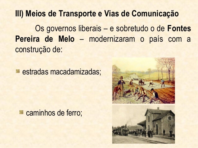 9. 9. III) Meios de Transporte e Vias de Comunicação Os governos liberais – e sobretudo o de FontesPereira de Melo – modernizaram o país com aconstrução de: estradas macadamizadas; caminhos de ferro;