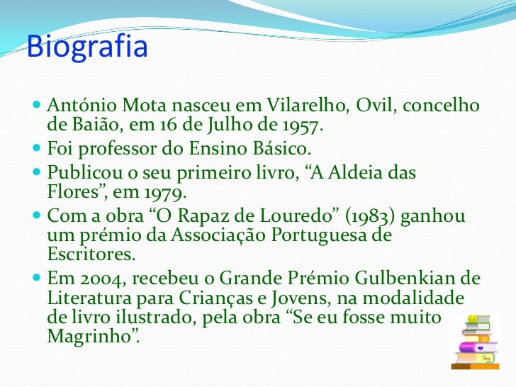 3. 3. Biografia<br />António Mota nasceu em Vilarelho, Ovil, concelho de Baião, em 16 de Julho de 1957. <br />Foi professor do Ensino Básico. <br />Publicou o seu primeiro livro, “A Aldeia das Flores”, em 1979. <br />Com a obra “O Rapaz de Louredo” (1983) ganhou um prémio da Associação Portuguesa de Escritores. <br />Em 2004, recebeu o Grande Prémio Gulbenkian de Literatura para Crianças e Jovens, na modalidade de livro ilustrado, pela obra “Se eu fosse muito Magrinho”. <br />