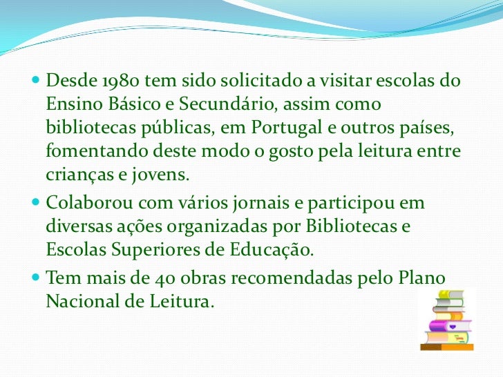 4. 4. Desde 1980 tem sido solicitado a visitar escolas do Ensino Básico e Secundário, assim como bibliotecas públicas, em Portugal e outros países, fomentando deste modo o gosto pela leitura entre crianças e jovens. <br />Colaborou com vários jornais e participou em diversas açõesorganizadas por Bibliotecas e Escolas Superiores de Educação.<br />Tem mais de 40 obras recomendadas pelo Plano Nacional de Leitura.<br />