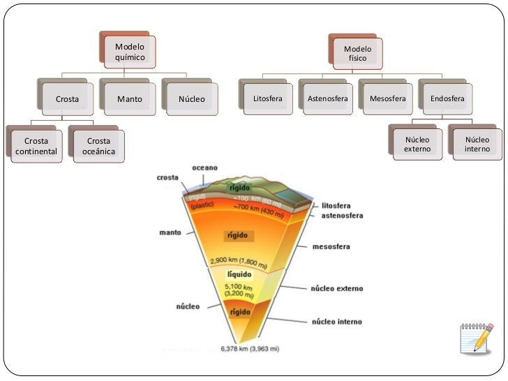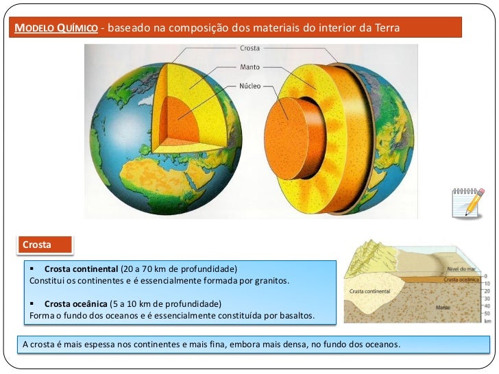 5. 5. Com base nas características dos materiais existentes no interior da Terra, obtidos atravésde métodos diretos e indiretos, os geólogos construíram dois modelos da estrutura internada Terra.  MODELO QUÍMICO, baseado na composição dos materiais do interior da Terra;  MODELO FÍSICO, baseado nas propriedades físicas dos materiais do interior da Terra. Modelo químico Modelo físico