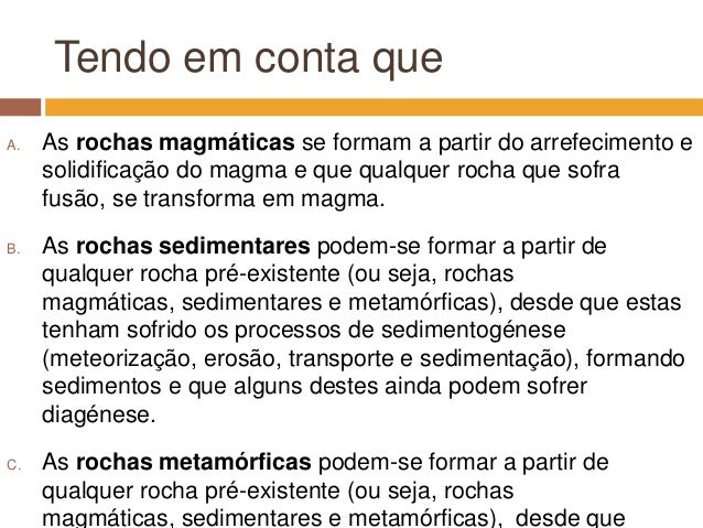 2. 2. Tendo em conta queA. As rochas magmáticas se formam a partir do arrefecimento e solidificação do magma e que qualquer rocha que sofra fusão, se transforma em magma.B. As rochas sedimentares podem-se formar a partir de qualquer rocha pré-existente (ou seja, rochas magmáticas, sedimentares e metamórficas), desde que estas tenham sofrido os processos de sedimentogénese (meteorização, erosão, transporte e sedimentação), formando sedimentos e que alguns destes ainda podem sofrer diagénese.C. As rochas metamórficas podem-se formar a partir de qualquer rocha pré-existente (ou seja, rochas magmáticas, sedimentares e metamórficas), desde que