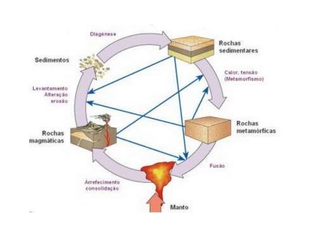6. 6. 1 2A – Rochas sedimentares 1 – sedimentogénese + diagéneseB – Rochas metamórficas 2 – metamorfismoC – Rochas magmáticas plutónicas 3 – fusãoD – Rochas magmáticas vulcânicas 4 – arrefecimento e solidificação