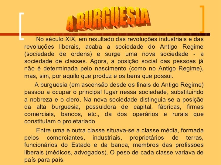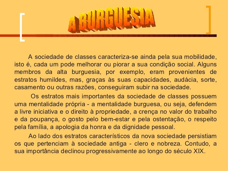 5. 5. A sociedade de classes caracteriza-se ainda pela sua mobilidade, isto é, cada um pode melhorar ou piorar a sua condição social. Alguns membros da alta burguesia, por exemplo, eram provenientes de estratos humildes, mas, graças às suas capacidades, audácia, sorte, casamento ou outras razões, conseguiram subir na sociedade. A BURGUESIA