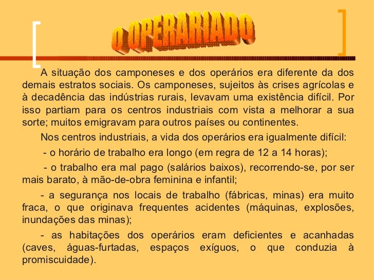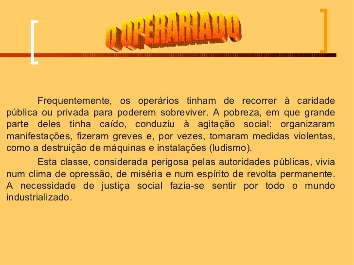 13. 13. O OPERARIADO Esta classe, considerada perigosa pelas autoridades públicas, vivia num clima de opressão, de miséria e num espírito de revolta permanente. A necessidade de justiça social fazia-se sentir por todo o mundo industrializado.