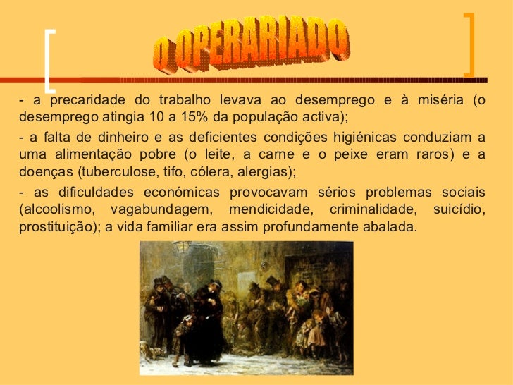 10. 10. - a falta de dinheiro e as deficientes condições higiénicas conduziam a uma alimentação pobre (o leite, a carne e o peixe eram raros) e a doenças (tuberculose, tifo, cólera, alergias); - as dificuldades económicas provocavam sérios problemas sociais (alcoolismo, vagabundagem, mendicidade, criminalidade, suicídio, prostituição); a vida familiar era assim profundamente abalada. Frequentemente, os operários tinham de recorrer à caridade pública ou privada para poderem sobreviver. A pobreza, em que grande parte deles tinha caído, conduziu à agitação social: organizaram manifestações, fizeram greves e, por vezes, tomaram medidas violentas, como a destruição de máquinas e instalações (ludismo). Esta classe, considerada perigosa pelas autoridades públicas, vivia num clima de opressão, de miséria e num espírito de revolta permanente. A necessidade de justiça social fazia-se sentir por todo o mundo industrializado. - a precaridade do trabalho levava ao desemprego e à miséria (o desemprego atingia 10 a 15% da população activa); - a falta de dinheiro e as deficientes condições higiénicas conduziam a uma alimentação pobre (o leite, a carne e o peixe eram raros) e a doenças (tuberculose, tifo, cólera, alergias); O OPERARIADO