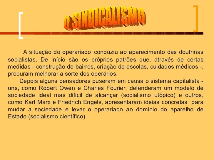 15. 15. Depois alguns pensadores puseram em causa o sistema capitalista - uns, como Robert Owen e Charles Fourier, defenderam um modelo de sociedade ideal mas difícil de alcançar (socialismo utópico) e outros, como Karl Marx e Friedrich Engels, apresentaram ideias concretas para mudar a sociedade e levar o operariado ao domínio do aparelho de Estado (socialismo científico). O SINDICALISMO