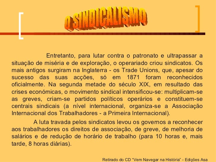 17. 17. O SINDICALISMO A luta travada pelos sindicatos levou os governos a reconhecer aos trabalhadores os direitos de associação, de greve, de melhoria de salários e de redução de horário de trabalho (para 10 horas e, mais tarde, 8 horas diárias). Retirado do CD “Vem Navegar na História” - Edições Asa