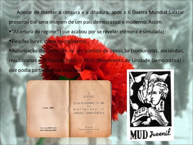 13. 13. Apesar de manter a censura e a ditadura, após a II Guerra Mundial Salazarprocurou dar uma imagem de um país democrático e moderno. Assim:•“Abertura do regime” (que acabou por se revelar efémera e simulada);•Eleições livres, como na Inglaterra;•Autorização da formação de um partido da oposição (comunistas, socialistas,republicanos e independentes) – MUD (Movimento de Unidade Democrática) -que podia participar nas eleições.