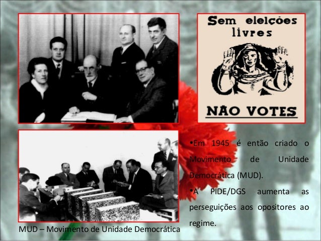 15. 15. •Em 1945 é então criado o Movimento de Unidade Democrática (MUD). •A PIDE/DGS aumenta as perseguições aos opositores ao regime.MUD – Movimento de Unidade Democrática