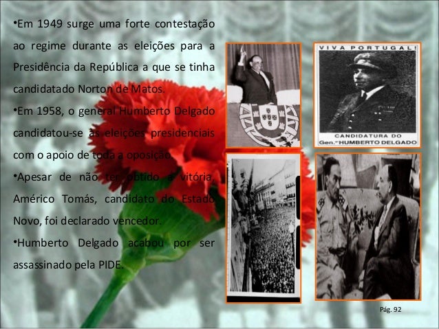 16. 16. •Em 1949 surge uma forte contestaçãoao regime durante as eleições para aPresidência da República a que se tinhacandidatado Norton de Matos.•Em 1958, o general Humberto Delgadocandidatou-se às eleições presidenciaiscom o apoio de toda a oposição.•Apesar de não ter obtido a vitória,Américo Tomás, candidato do EstadoNovo, foi declarado vencedor.•Humberto Delgado acabou por serassassinado pela PIDE. Pág. 92