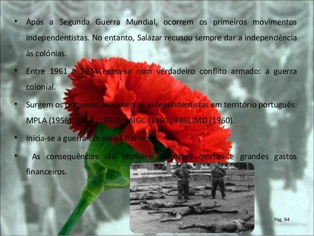 18. 18. • Após a Segunda Guerra Mundial, ocorrem os primeiros movimentos independentistas. No entanto, Salazar recusou sempre dar a independência às colónias.• Entre 1961 e 1974 entra-se num verdadeiro conflito armado: a guerra colonial.• Surgem os primeiros movimentos independentistas em território português: MPLA (1956); FNLA (1962); PAIGC (1960); FRELIMO (1960).• Inicia-se a guerra em várias frentes.• As consequências são terríveis: inúmeros mortos e grandes gastos financeiros. Pág. 94