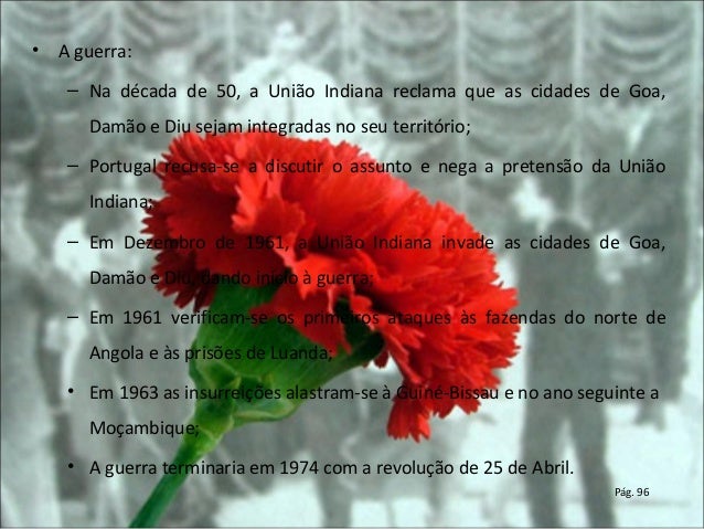 19. 19. • A guerra: – Na década de 50, a União Indiana reclama que as cidades de Goa, Damão e Diu sejam integradas no seu território; – Portugal recusa-se a discutir o assunto e nega a pretensão da União Indiana; – Em Dezembro de 1961, a União Indiana invade as cidades de Goa, Damão e Diu, dando início à guerra; – Em 1961 verificam-se os primeiros ataques às fazendas do norte de Angola e às prisões de Luanda; • Em 1963 as insurreições alastram-se à Guiné-Bissau e no ano seguinte a Moçambique; • A guerra terminaria em 1974 com a revolução de 25 de Abril. Pág. 96