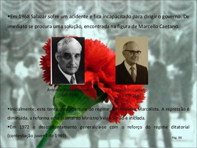 23. 23. •Em 1968 Salazar sofre um acidente e fica incapacitado para dirigir o governo. Deimediato se procura uma solução, encontrada na figura de Marcello Caetano. António Oliveira Salazar Marcello Caetano 1889-1970 1906-1980•Inicialmente, este tenta uma abertura do regime: a Primavera Marcelista. A repressão édiminuída, a reforma educacional do Ministro Veiga Simão é iniciada.•Em 1972 o descontentamento generaliza-se com o reforço do regime ditatorial(contestação juvenil de 1969). Pág. 98