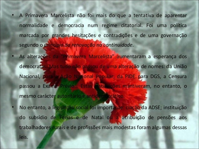 24. 24. • A Primavera Marcelista não foi mais do que a tentativa de aparentar normalidade e democracia num regime ditatorial. Foi uma política marcada por grandes hesitações e contradições e de uma governação segundo o princípio da renovação na continuidade.• As alterações da “Primavera Marcelista” aumentaram a esperança dos democratas. Mas tudo não passou de uma alteração de nomes: da União Nacional, para a Ação Nacional Popular; da PIDE para DGS, a Censura passou a Exame Prévio… Estas instituições mantiveram, no entanto, o mesmo carácter autoritário e antidemocrático.• No entanto, a legislação social foi importante: ciação da ADSE; instituição do subsídio de Férias e de Natal ou a atribuição de pensões aos trabalhadores rurais e de profissões mais modestas foram algumas dessas leis.
