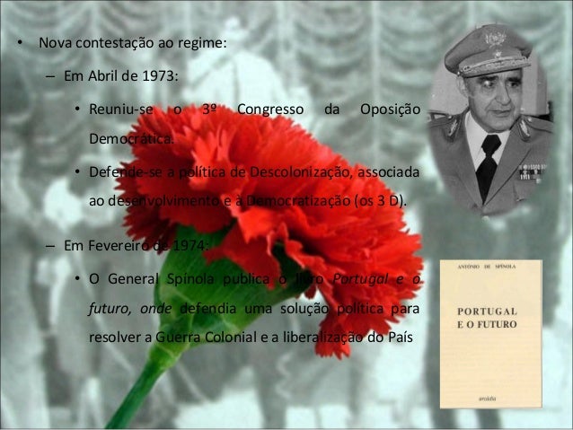 25. 25. • Nova contestação ao regime: – Em Abril de 1973: • Reuniu-se o 3º Congresso da Oposição Democrática. • Defende-se a política de Descolonização, associada ao desenvolvimento e à Democratização (os 3 D). – Em Fevereiro de 1974: • O General Spínola publica o livro Portugal e o futuro, onde defendia uma solução política para resolver a Guerra Colonial e a liberalização do País