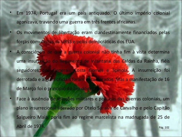 27. 27. • Em 1974, Portugal era um país antiquado. O último império colonial agonizava, travando uma guerra em três frentes africanas.• Os movimentos de libertação eram clandestinamente financiados pelas forças comunistas da URSS e pelas democráticas dos EUA.• A consciência de que a guerra colonial não tinha fim à vista determina uma insurreição do Regimento de Infantaria das Caldas da Rainha, fiéis seguidores dos Generais Costa Gomes e Spínola. A insurreição foi derrotada e alguns oficiais foram encarcerados. Mas a manifestação de 16 de Março foi o princípio do fim do regime.• Face à ausência de soluções militares e políticas das guerras coloniais, um plano insurrecional liderado por Otelo Saraiva de Carvalho e pelo Capitão Salgueiro Maia, poria fim ao regime marcelista na madrugada de 25 de Abril de 1974. Pág. 102