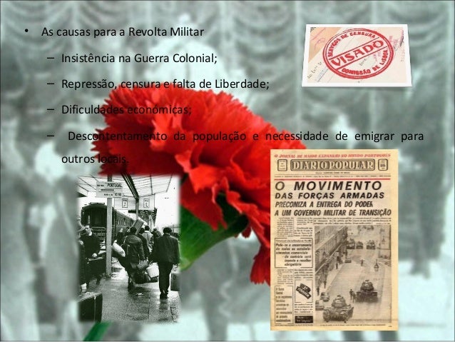 28. 28. • As causas para a Revolta Militar – Insistência na Guerra Colonial; – Repressão, censura e falta de Liberdade; – Dificuldades económicas; – Descontentamento da população e necessidade de emigrar para outros locais.