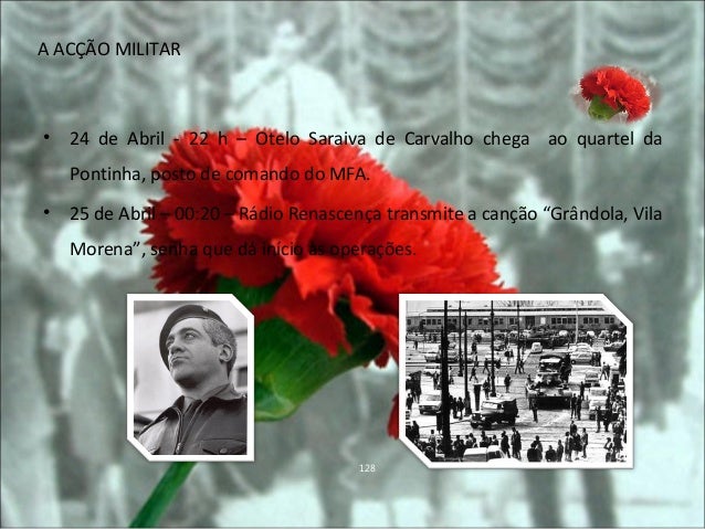30. 30. A ACÇÃO MILITAR• 24 de Abril - 22 h – Otelo Saraiva de Carvalho chega ao quartel da Pontinha, posto de comando do MFA.• 25 de Abril – 00:20 – Rádio Renascença transmite a canção “Grândola, Vila Morena”, senha que dá início às operações. 128
