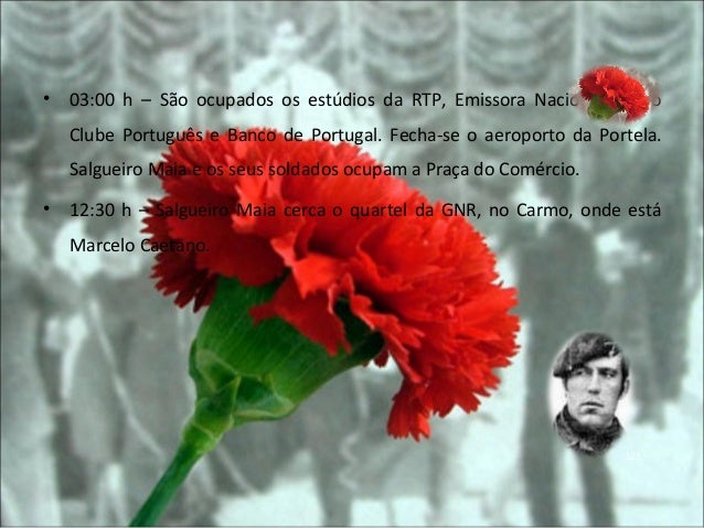31. 31. • 03:00 h – São ocupados os estúdios da RTP, Emissora Nacional, Rádio Clube Português e Banco de Portugal. Fecha-se o aeroporto da Portela. Salgueiro Maia e os seus soldados ocupam a Praça do Comércio.• 12:30 h – Salgueiro Maia cerca o quartel da GNR, no Carmo, onde está Marcelo Caetano. 128