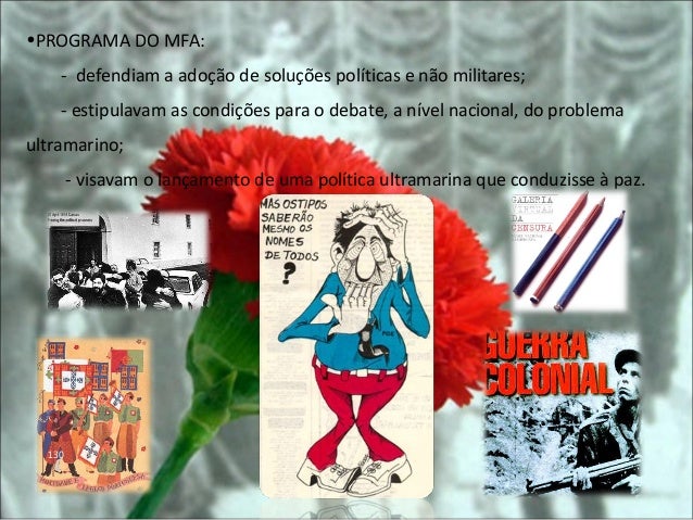 32. 32. •PROGRAMA DO MFA: - defendiam a adoção de soluções políticas e não militares; - estipulavam as condições para o debate, a nível nacional, do problemaultramarino; - visavam o lançamento de uma política ultramarina que conduzisse à paz. 130