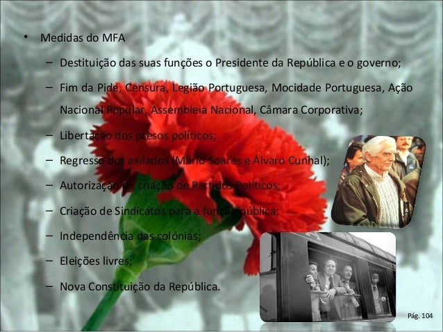 33. 33. • Medidas do MFA – Destituição das suas funções o Presidente da República e o governo; – Fim da Pide, Censura, Legião Portuguesa, Mocidade Portuguesa, Ação Nacional Popular, Assembleia Nacional, Câmara Corporativa; – Libertação dos presos políticos; – Regresso dos exilados (Mário Soares e Álvaro Cunhal); – Autorização de criação de Partidos Políticos; – Criação de Sindicatos para a função pública; – Independência das colónias; – Eleições livres; – Nova Constituição da República. Pág. 104
