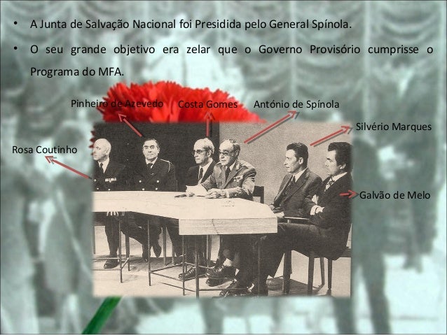35. 35. • A Junta de Salvação Nacional foi Presidida pelo General Spínola.• O seu grande objetivo era zelar que o Governo Provisório cumprisse o Programa do MFA. Pinheiro de Azevedo Costa Gomes António de Spínola Silvério MarquesRosa Coutinho Galvão de Melo