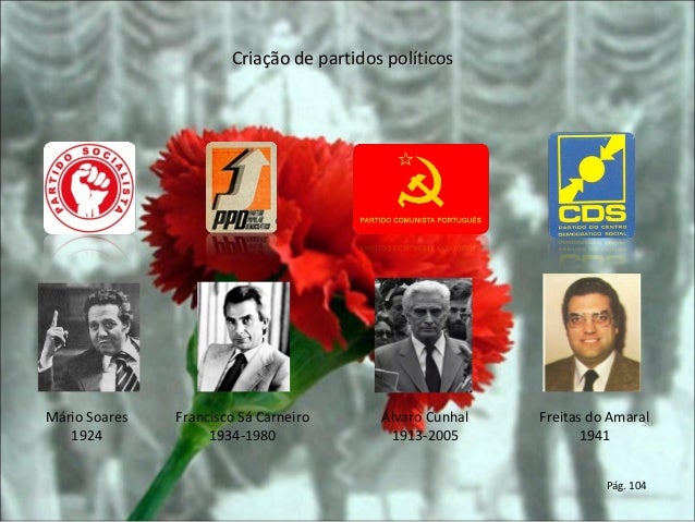 36. 36. Criação de partidos políticosMário Soares Francisco Sá Carneiro Álvaro Cunhal Freitas do Amaral 36 1924 1934-1980 1913-2005 1941 Pág. 104