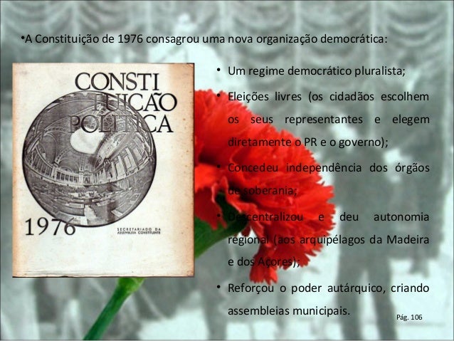 37. 37. •A Constituição de 1976 consagrou uma nova organização democrática: • Um regime democrático pluralista; • Eleições livres (os cidadãos escolhem os seus representantes e elegem diretamente o PR e o governo); • Concedeu independência dos órgãos de soberania; • Descentralizou e deu autonomia regional (aos arquipélagos da Madeira e dos Açores); • Reforçou o poder autárquico, criando assembleias municipais. Pág. 106