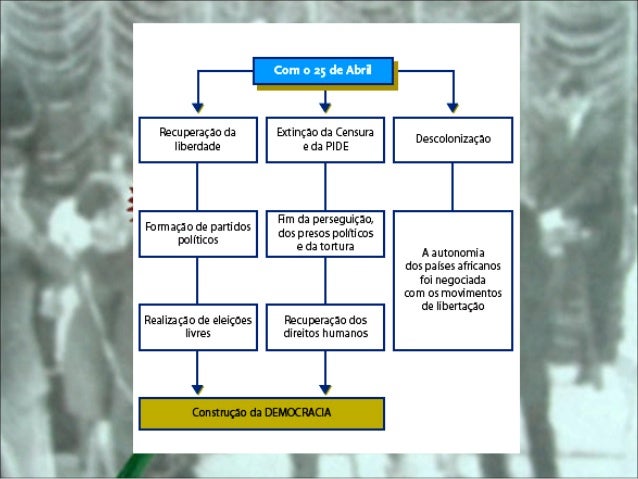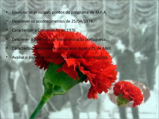 4. 4. • Enunciar os principais pontos do programa do M.F.A.• Descrever os acontecimentos de 25/04/1974.• Caracterizar a Constituição de 1976.• Descrever o processo de descolonização portuguesa.• Caracterizar a economia portuguesa do pós-25 de Abril.• Avaliar o papel da CEE / UE na atualidade portuguesa.