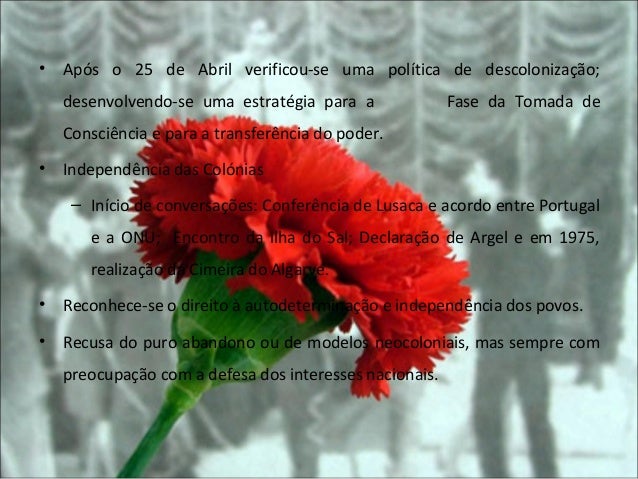 40. 40. • Após o 25 de Abril verificou-se uma política de descolonização; desenvolvendo-se uma estratégia para a Fase da Tomada de Consciência e para a transferência do poder.• Independência das Colónias – Início de conversações: Conferência de Lusaca e acordo entre Portugal e a ONU; Encontro da ilha do Sal; Declaração de Argel e em 1975, realização da Cimeira do Algarve.• Reconhece-se o direito à autodeterminação e independência dos povos.• Recusa do puro abandono ou de modelos neocoloniais, mas sempre com preocupação com a defesa dos interesses nacionais.