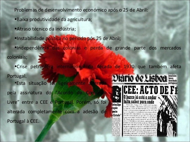 43. 43. Problemas de desenvolvimento económico após o 25 de Abril: •Baixa produtividade da agricultura; •Atraso técnico da indústria; •Instabilidade política no período pós 25 de Abril; •Independência das colónias e perda de grande parte dos mercadoscoloniais; •Crise petrolífera internacional da década de 1970 que também afetaPortugal. •Esta situação foi ligeiramente alteradapela assinatura do “Acordo de ComércioLivre” entre a CEE e Portugal. Porém, só foialterada completamente com a adesão dePortugal à CEE.