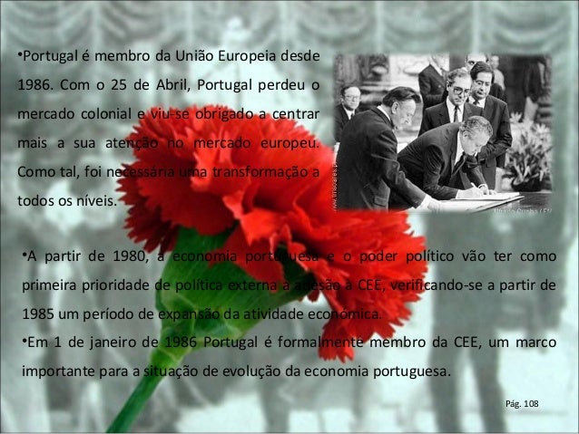 44. 44. •Portugal é membro da União Europeia desde1986. Com o 25 de Abril, Portugal perdeu omercado colonial e viu-se obrigado a centrarmais a sua atenção no mercado europeu.Como tal, foi necessária uma transformação atodos os níveis.•A partir de 1980, a economia portuguesa e o poder político vão ter comoprimeira prioridade de política externa a adesão à CEE, verificando-se a partir de1985 um período de expansão da atividade económica.•Em 1 de janeiro de 1986 Portugal é formalmente membro da CEE, um marcoimportante para a situação de evolução da economia portuguesa. Pág. 108