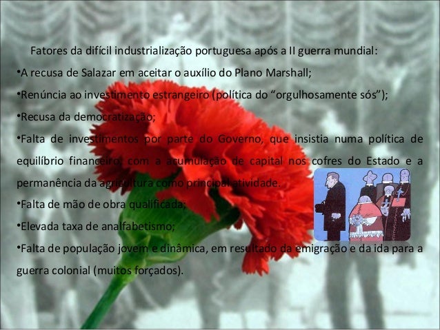 8. 8. Fatores da difícil industrialização portuguesa após a II guerra mundial:•A recusa de Salazar em aceitar o auxílio do Plano Marshall;•Renúncia ao investimento estrangeiro (política do “orgulhosamente sós”);•Recusa da democratização;•Falta de investimentos por parte do Governo, que insistia numa política deequilíbrio financeiro, com a acumulação de capital nos cofres do Estado e apermanência da agricultura como principal atividade.•Falta de mão de obra qualificada;•Elevada taxa de analfabetismo;•Falta de população jovem e dinâmica, em resultado da emigração e da ida para aguerra colonial (muitos forçados).