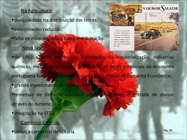 9. 9. Na Agricultura:•desigualdade na distribuição das terras;•investimento reduzido;•falta de mão-de-obra e baixa mecanização. Nova fase:•de 1953 a 1958 ocorre um incremento da industrialização: indústriasquímicas, metalúrgica, adubos e petróleo: as bases essenciais da economiaportuguesa foram estabelecidas através dos Planos de Fomento Económico;•grande investimento de capitais estrangeiros;•remessas de dinheiro enviadas pelos emigrantes e entrada de divisasatravés do turismo;•Integração na EFTA. Comércio Externo:•balança comercial deficitária. Pág. 86