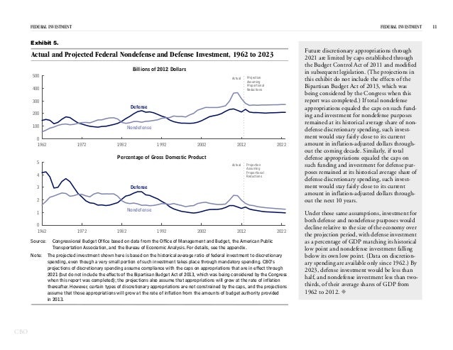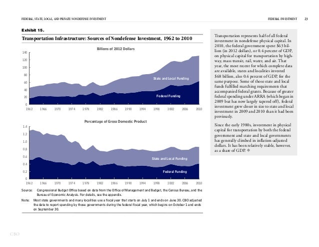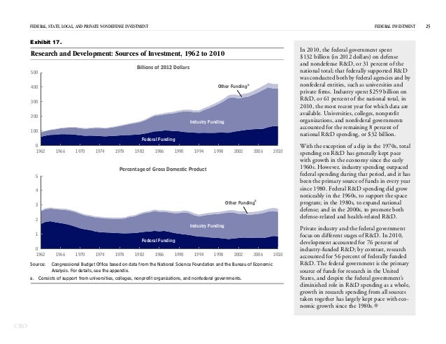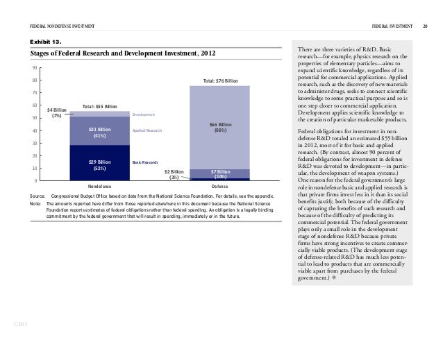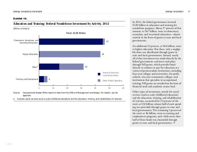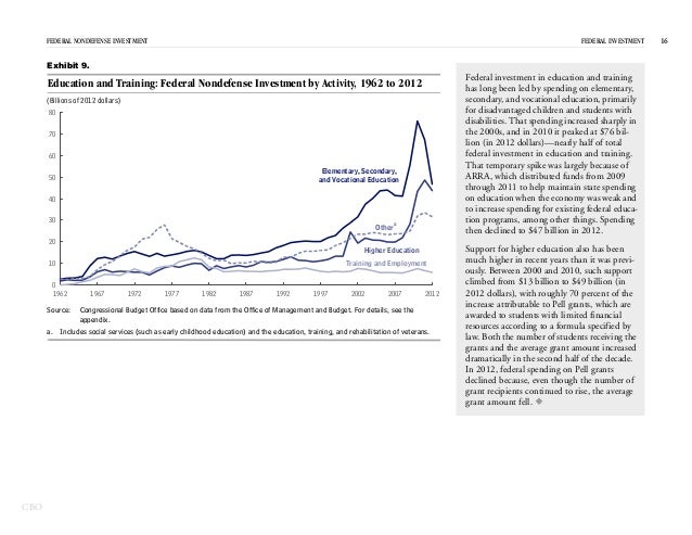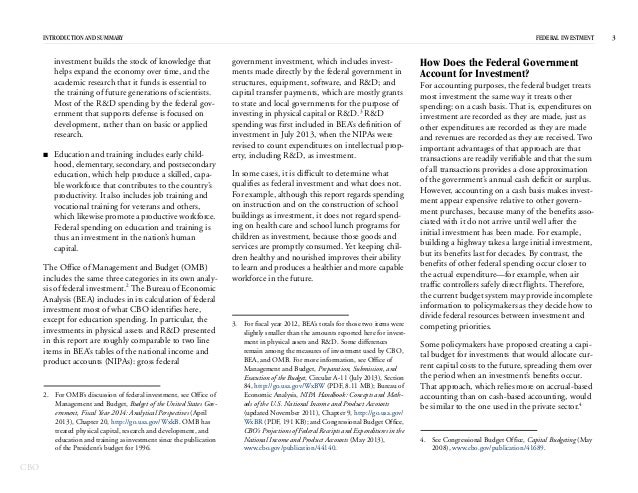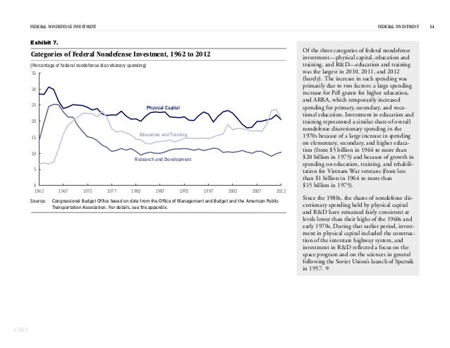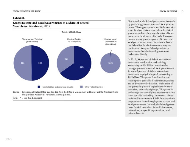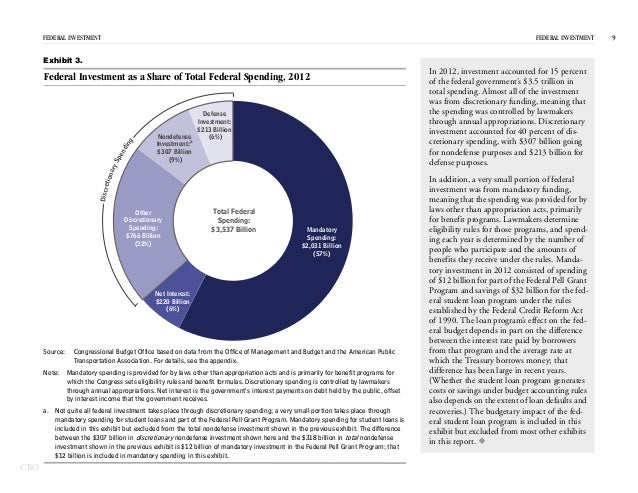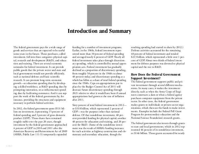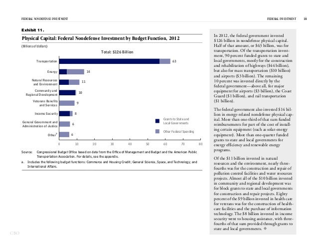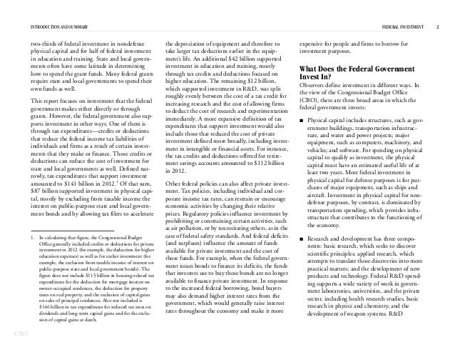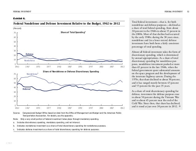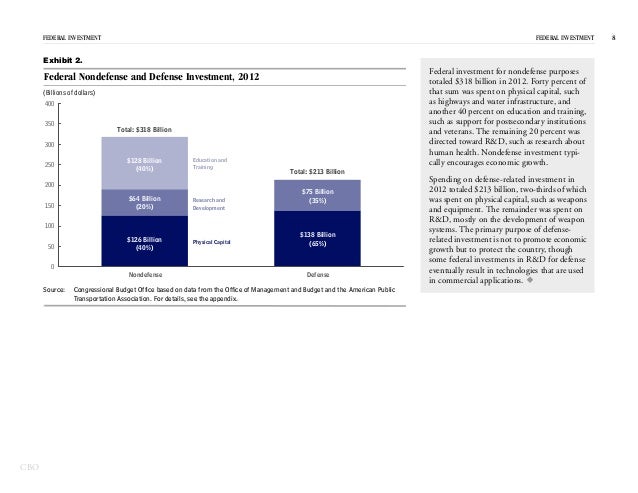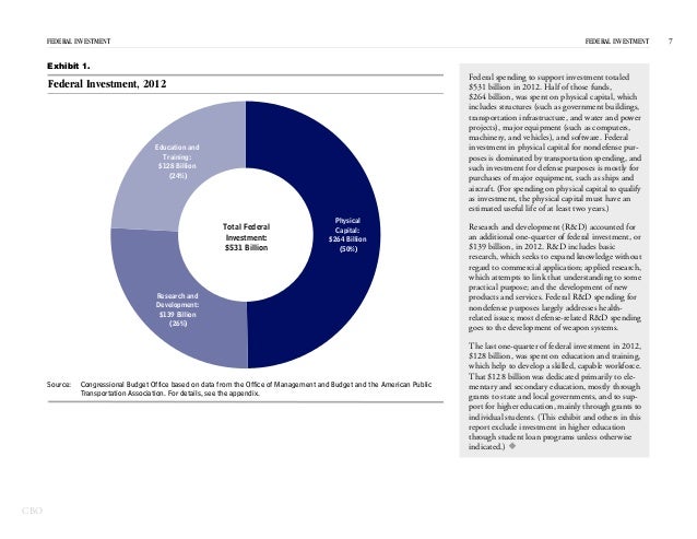 In 2012, the federal government spent $531 billion on investment—for physical capital; research and development; and education and training—which represented 15 percent of federal spending and 3 percent of GDP.