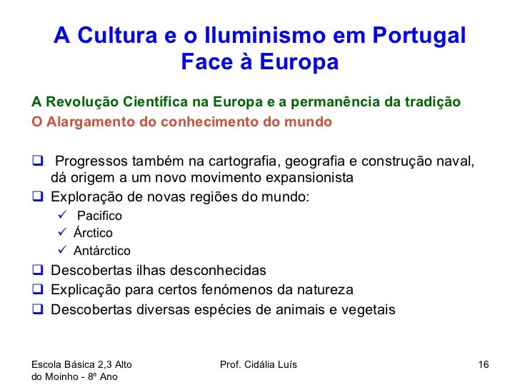 16. 16. A Cultura e o Iluminismo em Portugal Face à Europa <ul><li>A Revolução Científica na Europa e a permanência da tradição </li></ul><ul><li>O Alargamento do conhecimento do mundo </li></ul><ul><li>Progressos também na cartografia, geografia e construção naval, dá origem a um novo movimento expansionista </li></ul><ul><li>Exploração de novas regiões do mundo: </li></ul><ul><ul><li>Pacifico </li></ul></ul><ul><ul><li>Árctico </li></ul></ul><ul><ul><li>Antárctico </li></ul></ul><ul><li>Descobertas ilhas desconhecidas </li></ul><ul><li>Explicação para certos fenómenos da natureza </li></ul><ul><li>Descobertas diversas espécies de animais e vegetais </li></ul>Escola Básica 2,3 Alto do Moinho - 8º Ano Prof. Cidália Luís